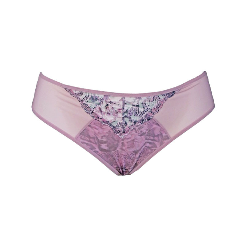 Cuecas de corte BRASILEIRO, feitas em malha estampada com renda na frente e malha dupla, com borda dobrada para um efeito sem costuras, atrás.