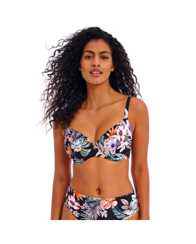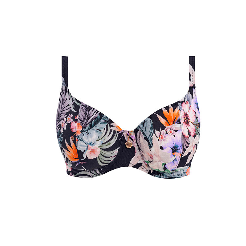 Enfrente a praia com estilo com este modelo de corte clássico e estampa de design único e marcante. Possui frente baixa para menos cobertura e copas forradas e com armação para maior forma e suporte. Um pingente dourado em forma de concha, na frente, oferece-lhe um acabamento elegante e luxuoso. Possui Alças fixas totalmente ajustáveis.