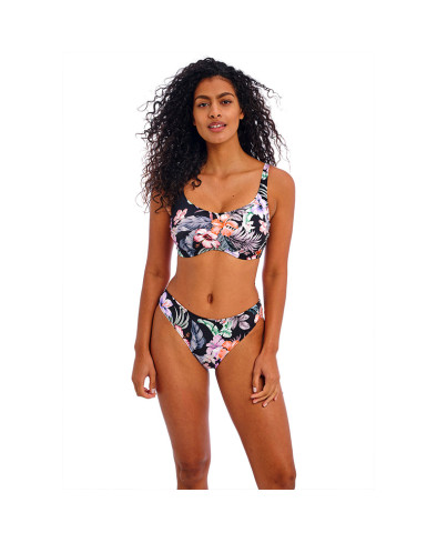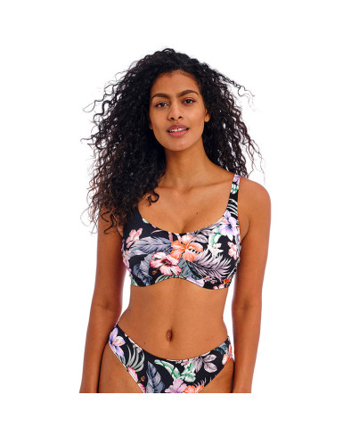 Modelo com decote redondo e alças largas para um look estilo "tank top" que se adapta a vários cenários! A estampa de tons pastéis ensolarados, acentuados contra a base preta e a combinação de verdes botânicos trabalham em harmonia para criar um visual único de paraíso tropical. O aro oculto oferece suporte adicional ao busto, enquanto os franzidos nas costuras laterais oferecem um formato bonito e lisonjeiro. Possui alças traseiras conversíveis, que podem ser usadas sobre os ombros ou cruzadas nas costas.