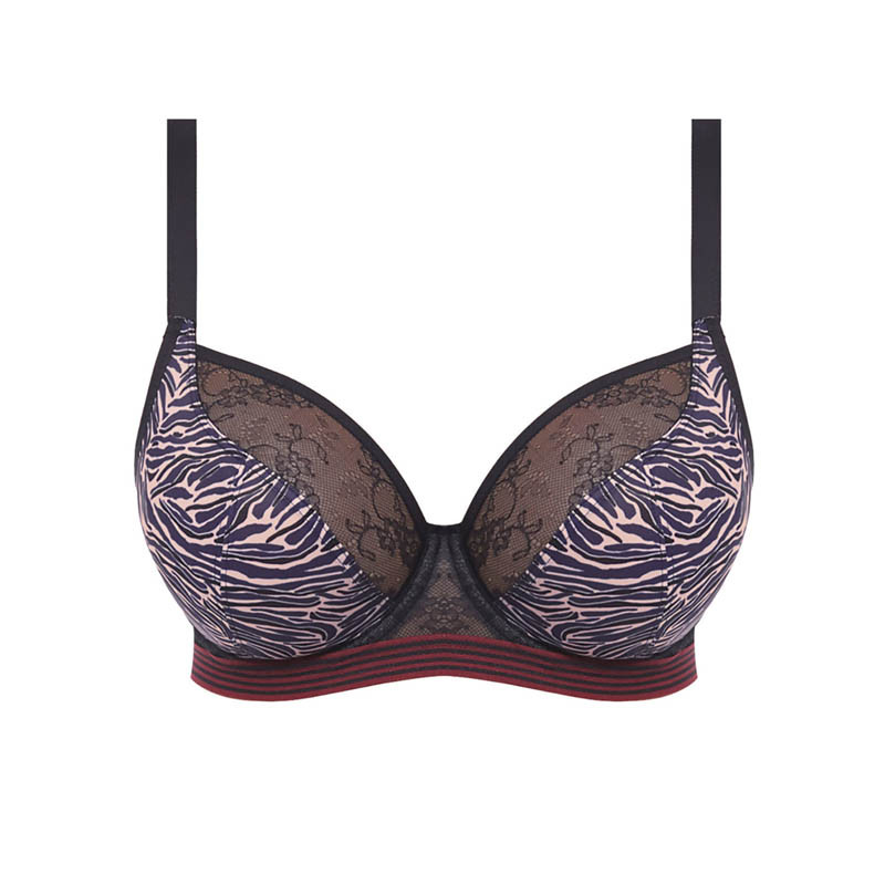 Modelo balcony de copa tripartida e com frente central baixa para um decote revelador. A parte superior das copas é em renda transparente. Os tecidos macios e uma faixa elástica listrada oferecem total conforto e suporte.